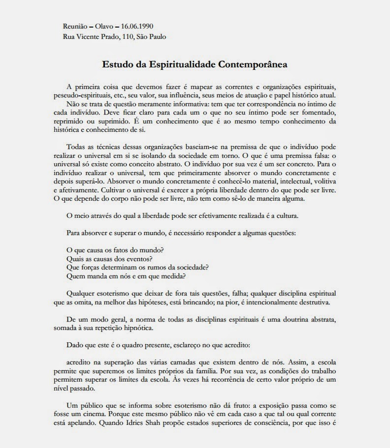 Divulgaremos agora a acta de fundação do curso de filosofia do astrólogo Olavo de Carvalho em São Paulo, que por alguma razão nos faz pensar no que se passou no COF de Curitiba, o tal que acabou em orgias, trocas de casais, famílias destruídas e um exorcismo. É mais uma prova, para além dos vídeos recomendados nos posts anteriores, de que estamos a lidar com uma seita. Leiam com atenção e tratem de estudar o caso antes de opinar. Comparem o que temos afirmado, sempre a partir de provas documentais e depoimentos, com o que o Sr. Olavo tem afirmado em sua defesa, sem esquecer de levar em conta a cronologia. A cada nova afirmação fantástica do guru, encontramos novas contradicções que indicam com precisão o que o Sr. Olavo tenta esconder, ao menos para quem já apreendeu o seu modus operandi. Abaixo da acta, publicarei as notas de um colaborador anónimo sem nenhuma correcção, de modo a servir de subsídio à leitura daqueles que precisam de um desenho.